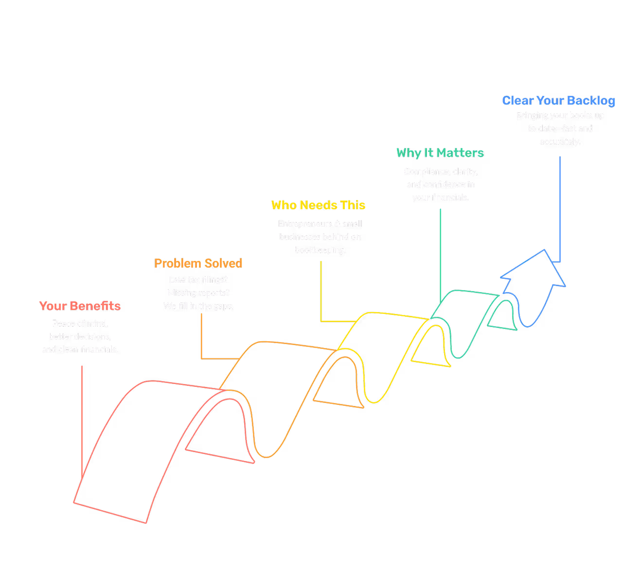 Get your books in order with expert catch-up bookkeeping services. Whether your books are months or years behind, our certified bookkeepers can clean them up, ensure accuracy, and make sure you stay compliant.